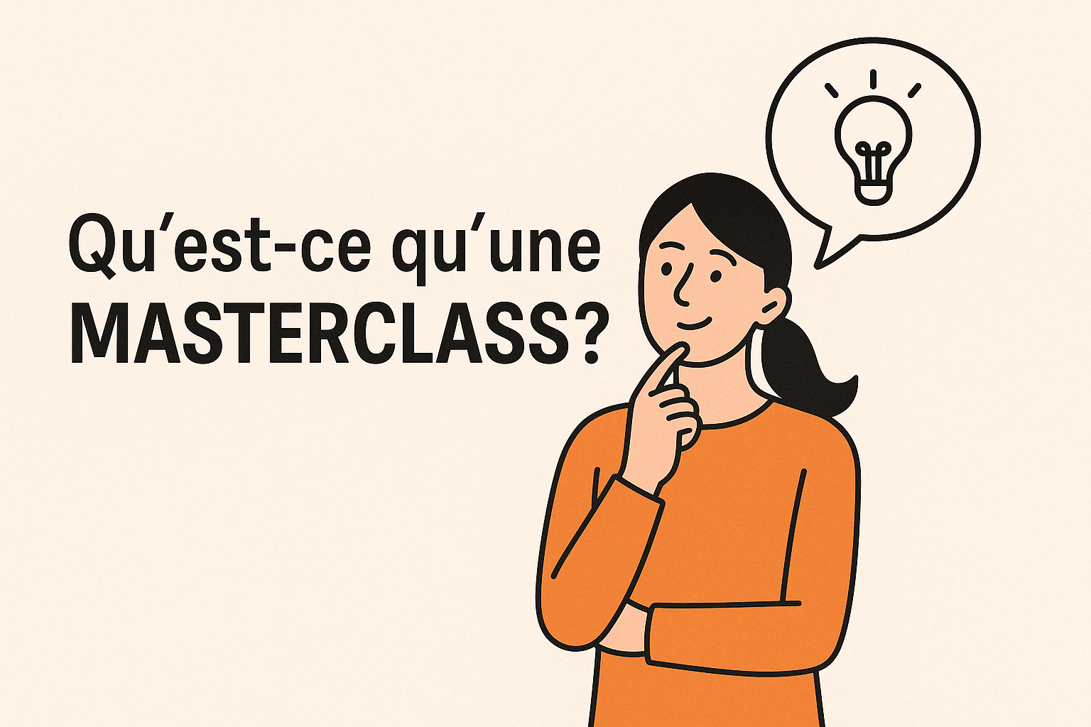 Une Masterclass est une séance de formation en direct, d'une durée déterminée, animée par un expert, qui transmet des méthodes, des conseils pratiques et des stratégies concrètes sur un sujet précis.